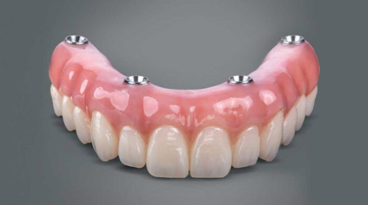 All-on-4 implants are a type of prosthetic used to restore the appearance of an entire arch of missing teeth (upper or lower) with only four dental implants. In front of the jawbone, two implants are placed vertically, and two are placed in the back at an angle. These four implants provide a safe and stable foundation for a complete, fixed dental bridge.